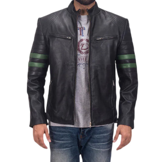 Men's Motorcycle Leather Jacket, Black, Quilted Shoulders, White Racing Stripes, Zip Front