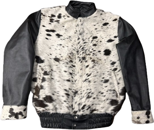 Cowhide Black White Hair on Hide Leather bomber Jacket, Black Sleeves with White Spotted Pattern, Elastic Waist