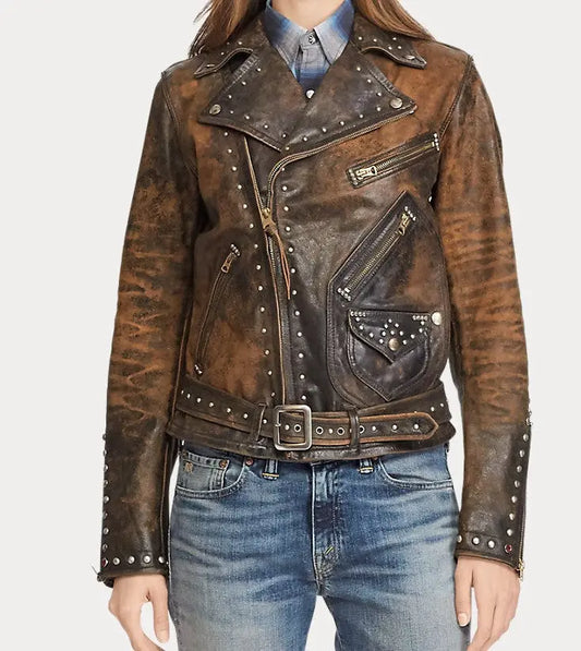 Leather Jacket brown Black Punk Full Silver Spiked Studded Zippered Jacket