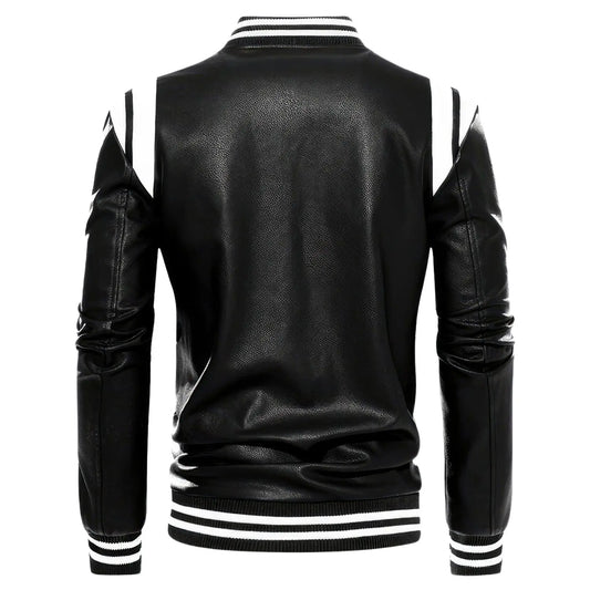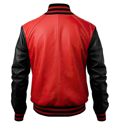 Men's leather jacket Black Sheepskin Baseball Jacket Red Stripes, Casual Classy Outfit