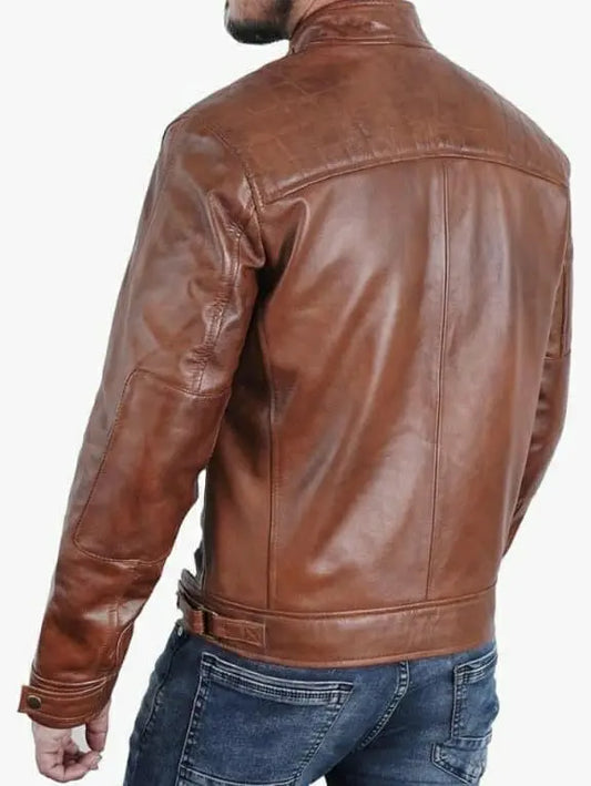 Men's Brown Quilted Moto Genuine Sheepskin men's leather jacket Distressed