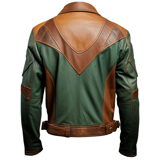 Men's Distressed Brown Jacket Sea Green Leather Jacket with Shirt Collar, Lightweight Racing Style