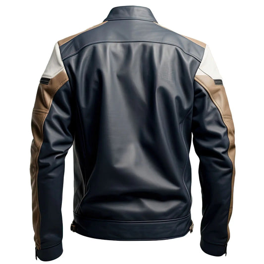 Men's Dusty Blue Brown Genuine Sheepskin Leather Racer Style Jacket, Stand Collar, Zip-up, Racer Style
