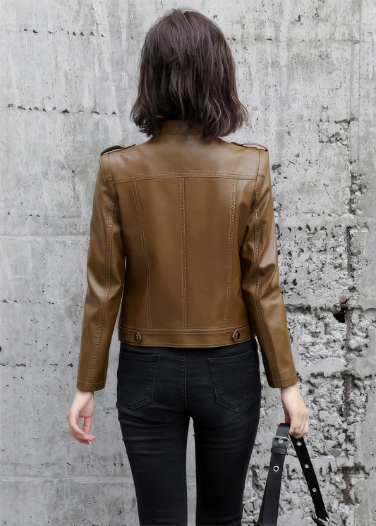 Women's Leather Jacket Sheepskin Stand Collar Korean Fashion Luxury Slim Fit Outwear Leather Jacket ll Brown
