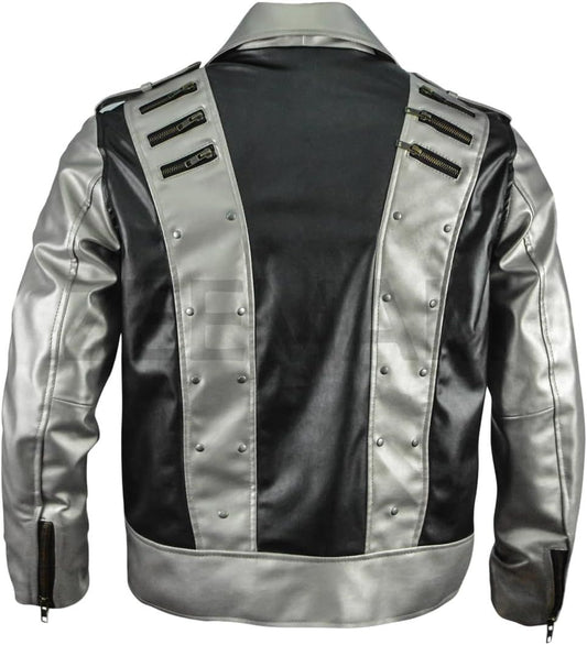 Metallic Silver and Black Motorcycle Jacket, Leather, Asymmetrical Zipper Design