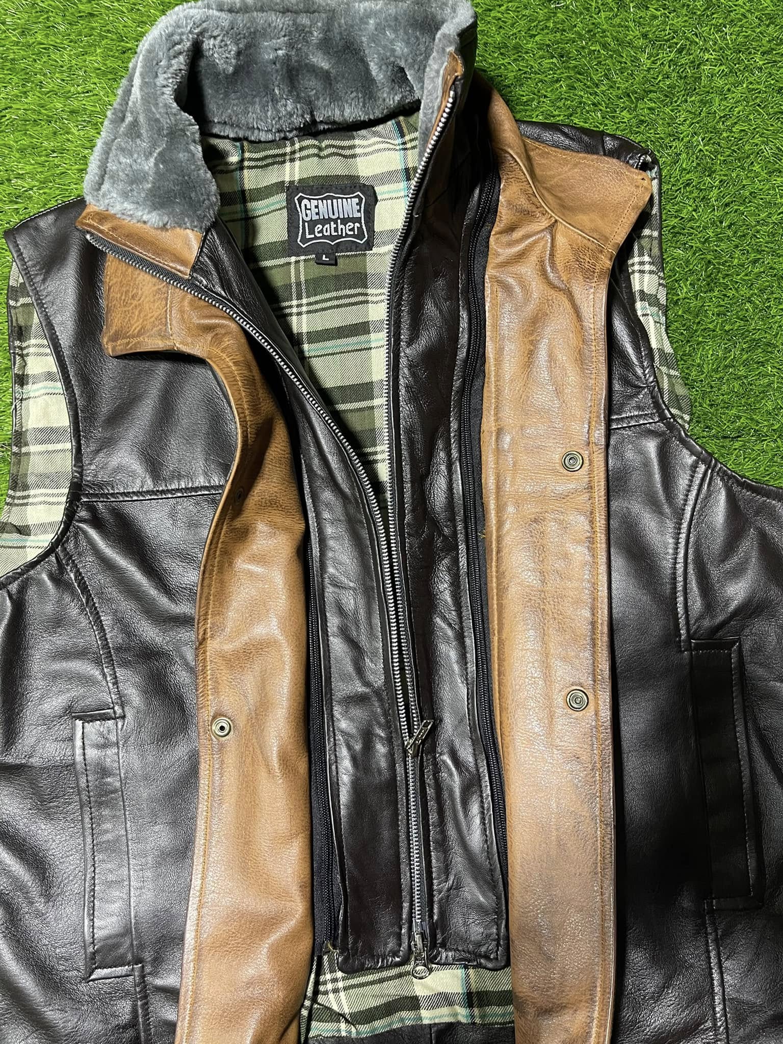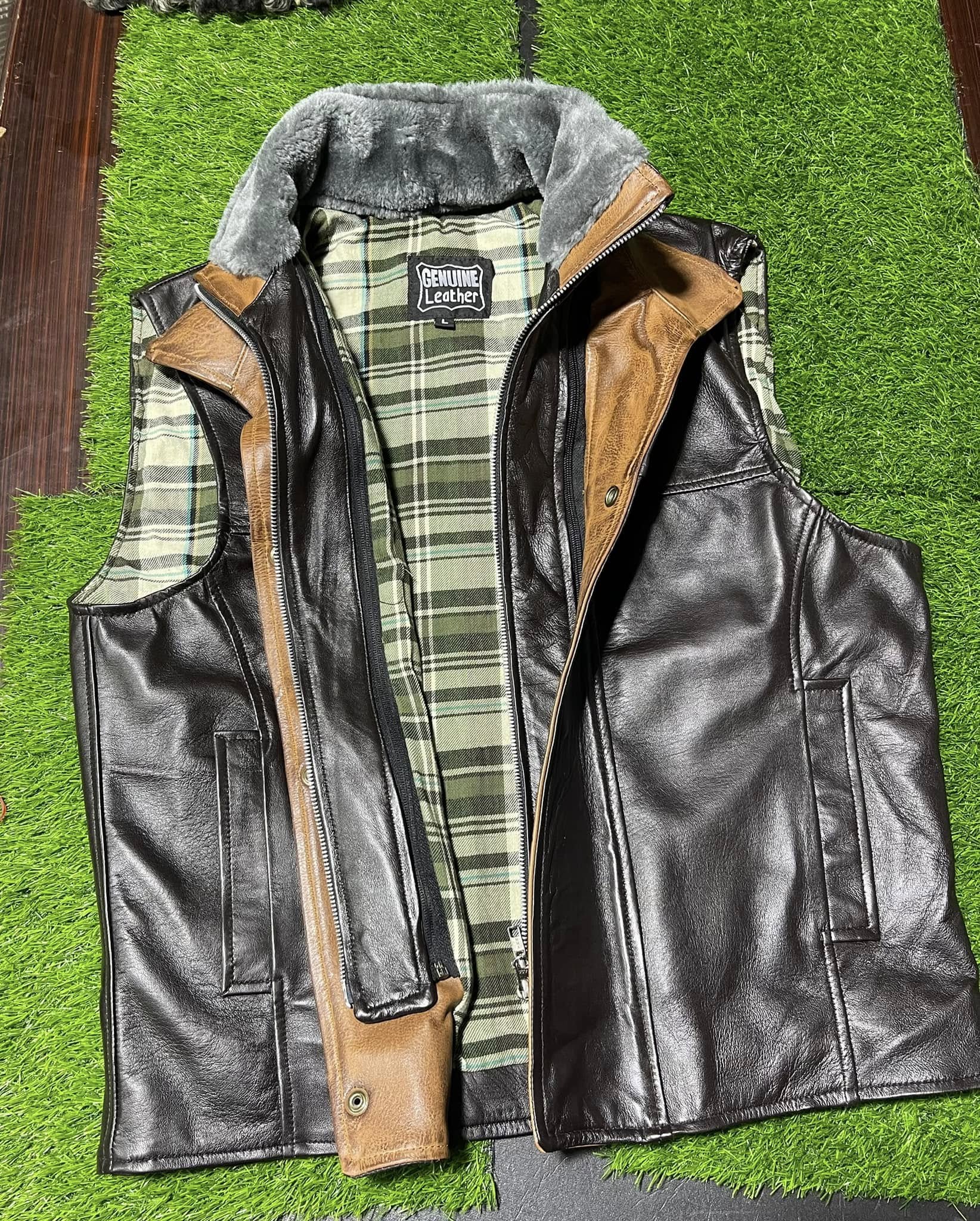 The Men’s Black Vest with Brown Shearling Lining is a stylish and versatile piece that is perfect for casual occasions. Made with high-quality leather, this mid-length vest features a solid brown color with a black leather outer shell. The zipper and button closure adds a touch of sophistication, while the fur trim accents give it a trendy edge. With a regular fit and available in sizes S to 3XL, this handmade vest from Hide Craft is a must-have for any wardrobe, especially in the winter, fall, or spring seasons.