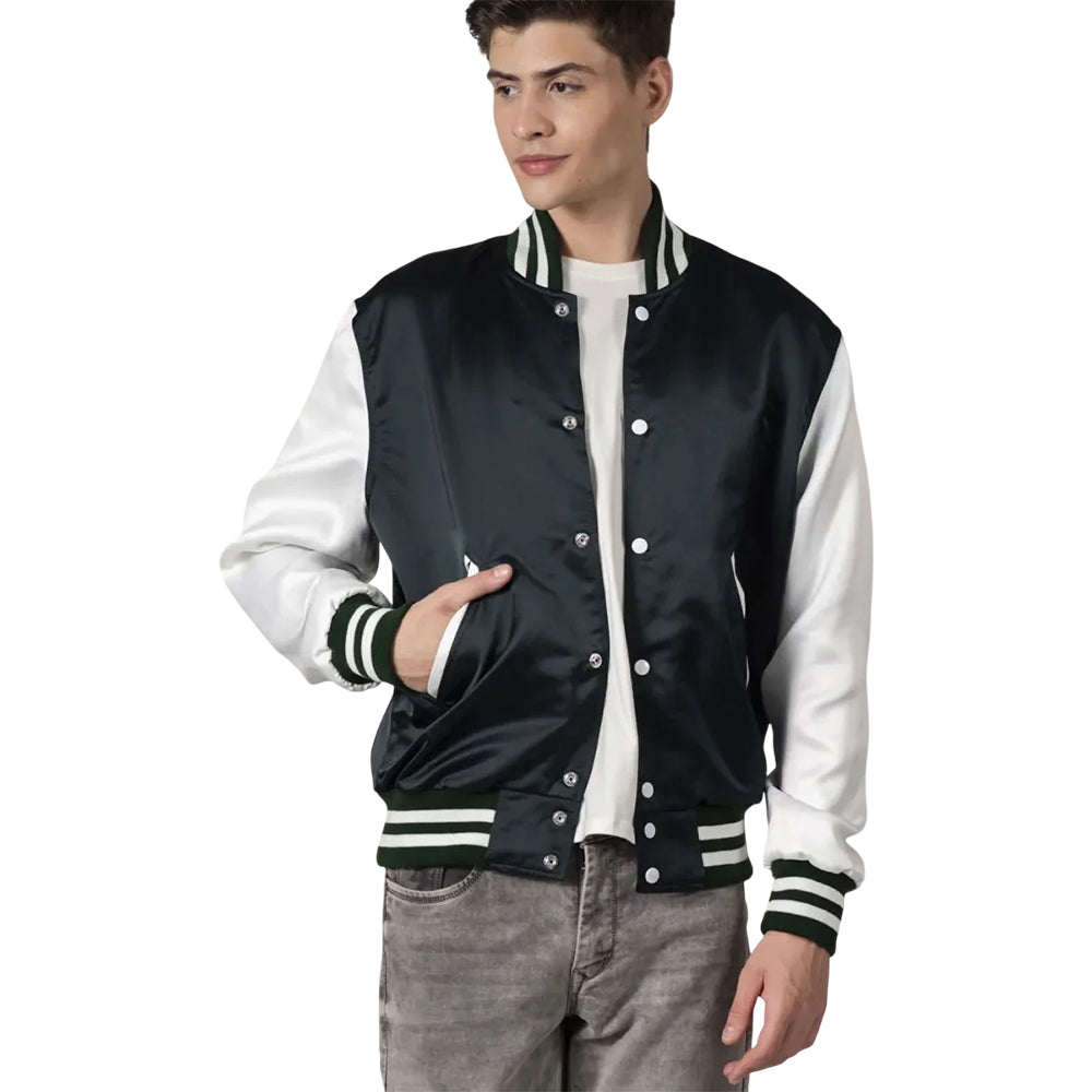 Men's Green Blue Satin Jacket With White Sleeves FREE SHIPPING